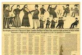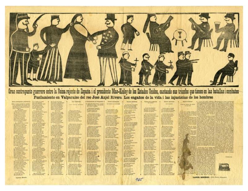 Gran contrapunto guerrero entre la Reina rejente de España i el presidente Mac-Kinley de los Estados Unidos, cantando sus triunfos que tienen en las batallas i combates ; Fusilamiento en Valparaiso del reo José Ánjel Rivero : los engaños de la vida i las injusticias de los hombres / Daniel Meneses. [Chile] : Imprenta Moneda, [1898?] 1 hoja : ilustraciones ; 55 x 73 cm. .
