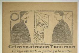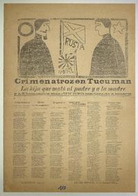 Crímen atroz en Tucuman : la hija que mató al padre y a la madre y a 2 hermanitos mas ; Un reo condenado a muerte / Daniel Meneses. [Chile] : Imprenta Leon Victor Caldera, [1904?] 1 hoja : ilustraciones ; 51 x 36 cm. .