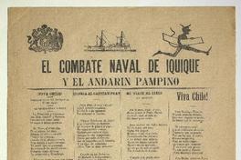El Combate Naval de Iquique y el andarin pampino / Daniel Meneses. Iquique : Imprenta Sud-Americana, [entre 1890-1909] 1 hoja : ilustraciones ; 39 x 28 cm. .