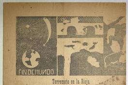 Terremoto en la Rioja / Juan B. Peralta. [Chile] : [Impresor no identificado], [1899?] 1 hoja : ilustraciones ; 54 x 39 cm. .