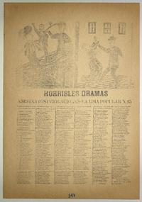 Horribles dramas : asesinatos i violaciones : la lira popular n. 15 / Juan B. Peralta. [Chile] : [Impresor no identificado], [1900?] 1 hoja : ilustraciones ; 56 x 39 cm. .