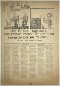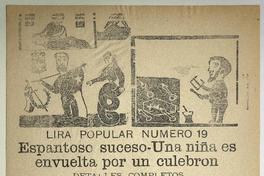 Espantoso suceso : una niña es envuelta por un culebron : detalles completos : lira popular numero 19 / Juan B. Peralta. [Chile] : [Impresor no identificado], [1901?] 1 hoja : ilustraciones ; 54 x 38 cm. .
