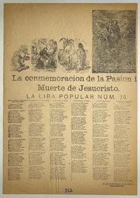 La conmemoracion de la pasion i muerte de Jesucristo : la lira popular núm. 20 / Juan Bautista Peralta. [Chile] : [Impresor no identificado], [1901?] 1 hoja : ilustraciones ; 55 x 39 cm. .