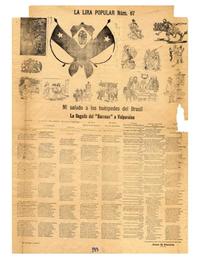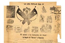 Mi saludo a los huéspedes del Brasil ; La llegada del "Barroso" a Valparaiso : la lira popular núm. 67 / Juan B. Peralta. [Chile] : Imprenta "El Debate", [entre 1890-1933] 1 hoja : ilustraciones ; 70 x 50 cm. .