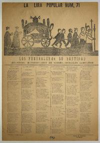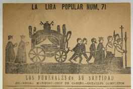 Los funerales de su santidad : grandiosa manifestacion de cariño : detalles completos : la lira popular num. 71 / Juan B. Peralta. [Chile] : B. Rojas, [entre 1890-1933] 1 hoja : ilustraciones ; 55 x 39 cm. .