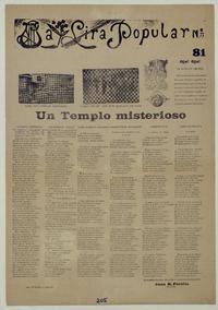 Un templo misterioso : la lira popular no. 81 / Juan B. Peralta. [Chile] : Imprenta "El Debate", [entre 1890-1933] 1 hoja : ilustraciones ; 55 x 39 cm. .