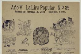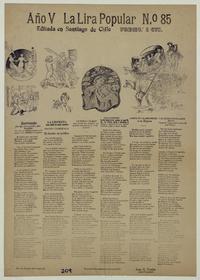 La lira popular año V no. 85 / Juan B. Peralta. Santiago de Chile : Imprenta El Patriota, [entre 1890-1933] 1 hoja : ilustraciones ; 55 x 39 cm. .