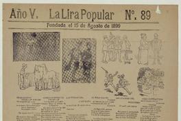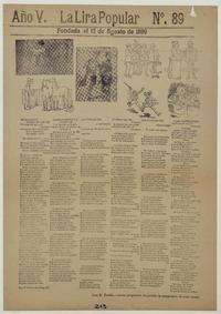 La lira popular año V no. 89 / Juan B. Peralta. [Santiago de Chile] : Imprenta El Patriota, [1904?] 1 hoja : ilustraciones ; 55 x 39 cm. .