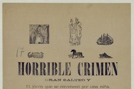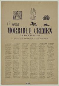 Horrible crimen : gran salteo ; Y el jóven que se envenenó por una niña / Adolfo Reyes. [Chile] : [Impresor no identificado], [entre 1890-1901] 1 hoja : ilustraciones ; 52 x 35 cm. .