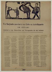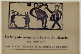 Un sarjento asesinó á un Cabo en Antofagasta ; Un cuyano asesinó a un Guardian en Talagante de un balazo / Desiderio Parra. [Chile] : [Impresor no identificado], [1902?] 1 hoja : ilustraciones ; 54 x 39 cm. .