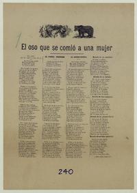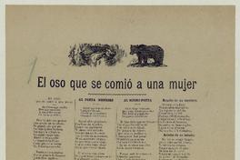 El oso que se comió a una mujer / J. Hipolito Cordero. [Chile] : [Impresor no identificado], [1890?] 1 hoja : ilustraciones ; 39 x 28 cm. .