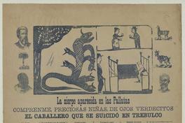 La sierpe aparecida en las Pallatas ; Comprenme, preciosas niñas, de ojos verdecitos ; El caballero que se suicidó en Trebulco / Jose Hipolito Cordero. [Chile] : Imprenta Moneda, [1890?] 1 hoja : ilustraciones ; 57 x 39 cm. .