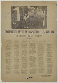 Contrapunto entre el despachero i el tomador : cómprame niña bonita / Jose Hipolito Cordero. [Chile] : [Impresor no identificado], [1894?] 1 hoja : ilustraciones ; 56 x 38 cm. .