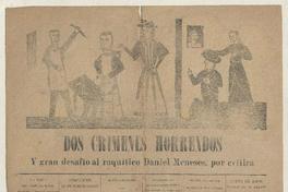 Dos crimenes horrendos ; Y gran desafío al raquítico Daniel Meneses, por crítica / Javier Jerez. [Chile] : [Impresor no identificado], [1890?] 1 hoja : ilustraciones ; 54 x 38 cm. .