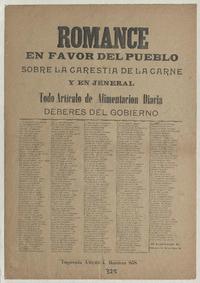 Romance en favor del pueblo sobre la carestia de la carne y en jeneral todo artículo de alimentacion diaria : deberes del gobierno C. Carvajal C.