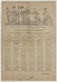 Contestacion a las sátiras de Meneses ; Los presos sin distincion de categoria ; Versos dedicados a los aficionados a las carreras / Justo Robles. [Valparaíso] : Imprenta Valparaíso, [1890?] 1 hoja : ilustraciones ; 55 x 38 cm. .