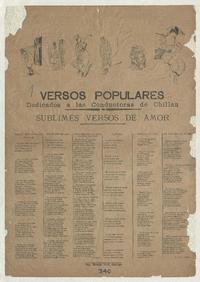 Versos populares : dedicados a las conductoras de Chillan ; Sublimes versos de amor / El Poeta Chillan. Santiago : Imprenta Moneda, [1890?] 1 hoja : ilustraciones ; 54 x 38 cm. .