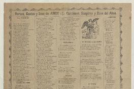Versos, cantos y ecos de amor. Canciones, suspiros y ecos del alma. [Chile] : [Impresor no identificado], [1890?] 1 hoja : ilustraciones ; 45 x 33 cm. .
