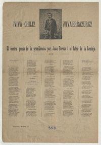 ¡Viva Chile! ¡Viva Errazuriz! ; El contra punto de la presidencia por Juan Poroto i el futre de la Lenteja. [Chile] : Imprenta Moneda, [1896?] 1 hoja : ilustraciones ; 54 x 37 cm. .