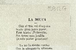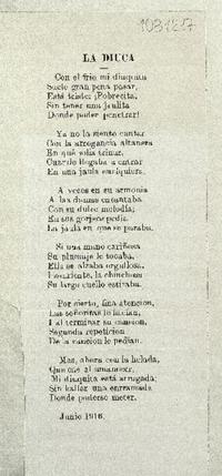La Diuca. [Lugar de publicación de no identificado] : [Impresor no identificado], 1916. 1 hoja ; 10 x 22 cm. plegado a 9 x 14 cm. .