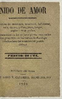 Nido de amor : colección de canciones, mazurcas, habaneras, vals, cuecas, polkas, jotas, tangos, coplas i otras yerbas : entresacados de las mejores piezas entrenadas con gran éxito en los letreros de Santiago i dedicadas a las amantes del pueblo chileno. Santiago de Chile : Imp. León V. Caldera, 1902. 23 páginas, 1 página sin enumerar ; 13 cm. .