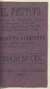 El festivo : colección de canciones nuevas : zarzuelas, schotihs, valses, zamacuecas, brindis, polkas, habaneras, jotas / por Periquito Sarmiento. Santiago ; Paris ; Londres : [Impresor no identificado], 1904. 24 páginas ; 12 cm. .