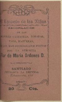 El encanto de las niñas : recopilación de las mejores canciones, tonadas, vals, mazurkas, de los más distinguidos poetas / por la señorita Flor de María Órdenes D. Santiago : Imprenta La Defensa, 1907. 32 páginas ; 13 cm. .