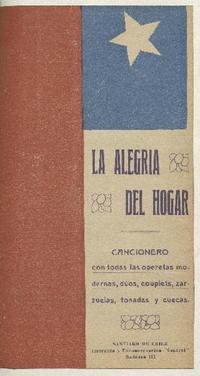 La Alegría del hogar : que contiene la más completa colección de canciones, valses, habaneras, vidalitas, cuecas, dúos, couplets de zarzuelas y operetas de renombrados autores, cuyo éxito está reconocido por todo el mundo : tonadas y cuecas de pata en quincha / recopilados por M. Gallardo N. Santiago de Chile : Imprenta y Encuadernación "Central", 1913. 95, [1] páginas ; 17 cm. .
