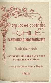 Lo que se canta en Chile : cancionero modernísimo : colección selecta y variada : canciones de moda para todo instrumento musical : arte, buen gusto, amor y alegría. [Chile] : [Imp. Renacimiento], 1913. 83 páginas : ilustraciones ; 13 cm. .