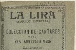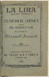 La Lira : colección de cantares para arpa, guitarra o piano / recopilados por Máximo V. Torres R. Santiago de Chile : Imp. "La Lira" de M. V. Torres R., 1908. 48 páginas ; 13 cm. .