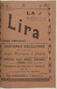 La Lira : cantares escojidos : para arpa, guitarra o piano : canciones, vals, cuecas, cantares, tonadas, etc. / recopilados por Máximo V. Torres R. [Santiago] : Imprenta Bellavista, 1911. 48 páginas ; 13 cm. .