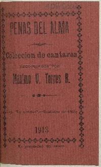 Penas del alma : colección de cantares / recopilados por Máximo V. Torres R. Santiago de Chile : Imp. "La Verdad", 1913. 48 páginas : ilustraciones ; 13 cm. .