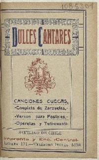 Dulces cantares : nueva recopilación de tangos, valses, canciones, cuecas, couplets de zarzuelas, versos para postales, operetas y tuti-cuanti Santiago de Chile : Imprenta y Enc. "Central", 1916. 47, [1] páginas ; 13 cm. .