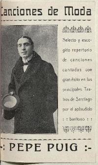 Canciones de moda / cantadas por Pepe Puig. Santiago ; Valparaíso : Soc. Imp. Lit. Barcelona, 1916. 51 páginas ; 15 cm. .