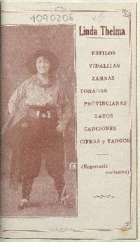Estilos, vidalitas, zambas, tonadas, provincianas, gatos, canciones, cifras y tangos : (repertorio exclusivo) / Linda Thelma. [Lugar de publicación no identificado] : [Impresor no identificado], [1913?] 24 páginas ; 17 cm. .
