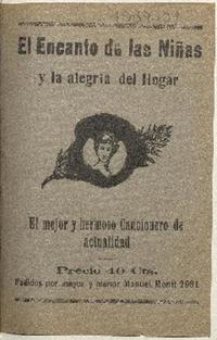 El Encanto de las niñas y la alegría del hogar : el mejor y hermoso cancionero de actualidad. [Santiago] : [Imprenta Las Artes], [1919?] 30, [2] páginas ; 13 cm. .