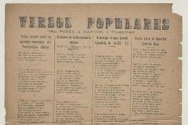 Versos populares del poeta y cantor J. Vasquez. [Antofagasta] : [Editor no identificado], [1945?] (Antofagasta : Imprenta "Rossi") 1 hoja ; 38 x 28 cm. .