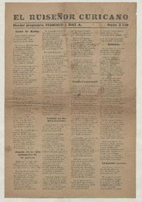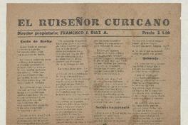 El Ruiseñor Curicano / director propietario: Francisco J. Diaz A. ([Curicó] : [Editor no identificado], [1945?] (Curicó : Imprenta y Diario "La Idea") 1 hoja ; 38 x 26 cm. .