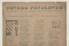 Versos populares / de Raimundo Navarro Flores. [Chile] : [Impresor no identificado], [entre 1890 y 1956] 1 hoja : ilustraciones ; 38 x 27 cm. .