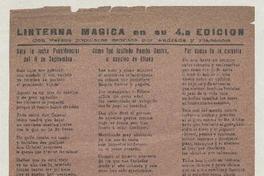 Linterna Magica en su 4.a edicion con versos populares / escritos por Andrade y Placencia. [Chile] : [Editor no identificado], [1952?] 1 hoja ; 36 x 22 cm. .