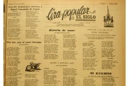 Por qué está el sauce llorando / Luis Polanco -- Injusticia y cosas tristes / Pedro María Tejos -- Por la libertad de un canario / José Riel -- Historia de amor / Rafael Martínez Navia -- Desafio a Edmundo Lazo / Luis Castañeda -- La trilla / Sergio Valentín Mora -- Homenaje a la Lira en su primer aniversario / Luis Castañeda -- Mi ranchito / Alejandro, poeta popular de Santiago.