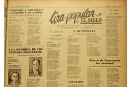 A la memoria de los esposos Rosenberg / José Riel -- Cosas de amor / Luis Polanco -- Respondo al Diablo Cojuelo / Tristán -- El cantar de un minero / Miguel Pino Piña -- Después de la tempestad nace la calma / Máximo Ramírez -- A Guatemala / C. Castillo -- La bestia en acción / Ricardo González -- ¡Fuera de Guatemala los asesinos! / Guillermo Hernández.