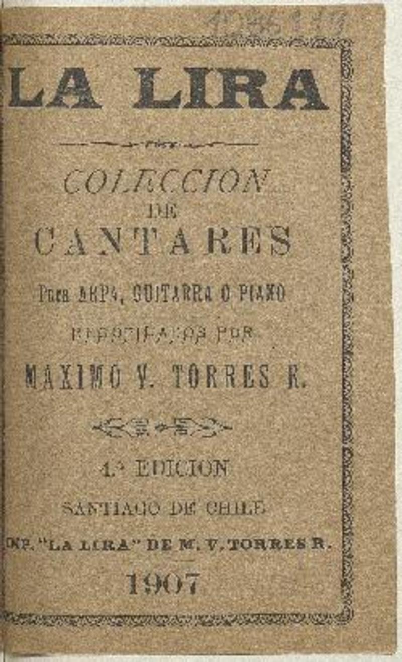 La Lira : cantares escojidos : para arpa, guitarra o piano : canciones, vals, cuecas, cantares, tonadas, etc. recopilados por Máximo V. Torres R.