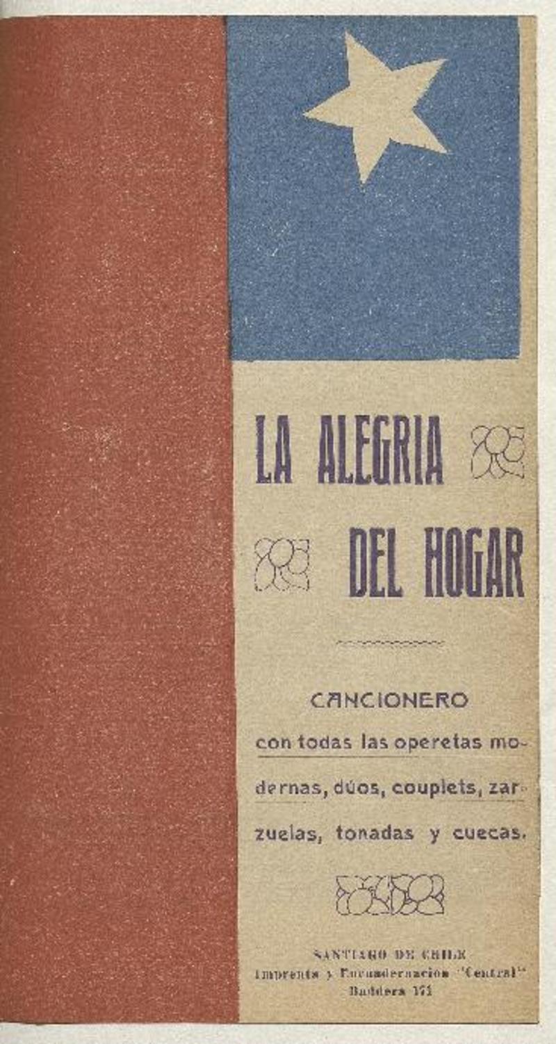 La Alegría del hogar : que contiene la más completa colección de canciones, valses, habaneras, vidalitas, cuecas, dúos, couplets de zarzuelas y operetas de renombrados autores, cuyo éxito está reconocido por todo el mundo : tonadas y cuecas de pata en quincha recopilados por M. Gallardo N.