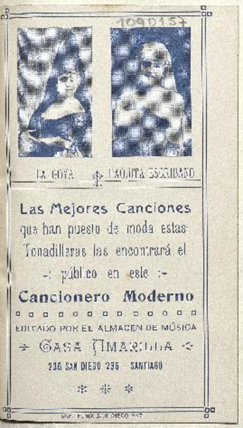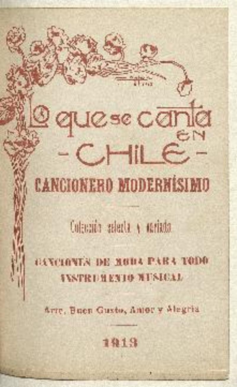 Lo que se canta en Chile : cancionero modernísimo : colección selecta y variada : canciones de moda para todo instrumento musical : arte, buen gusto, amor y alegría.