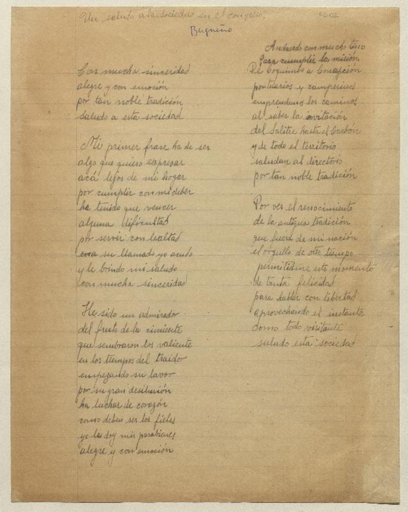 Un saludo a la sociedad en el congreso [manuscrito] Bugueño.