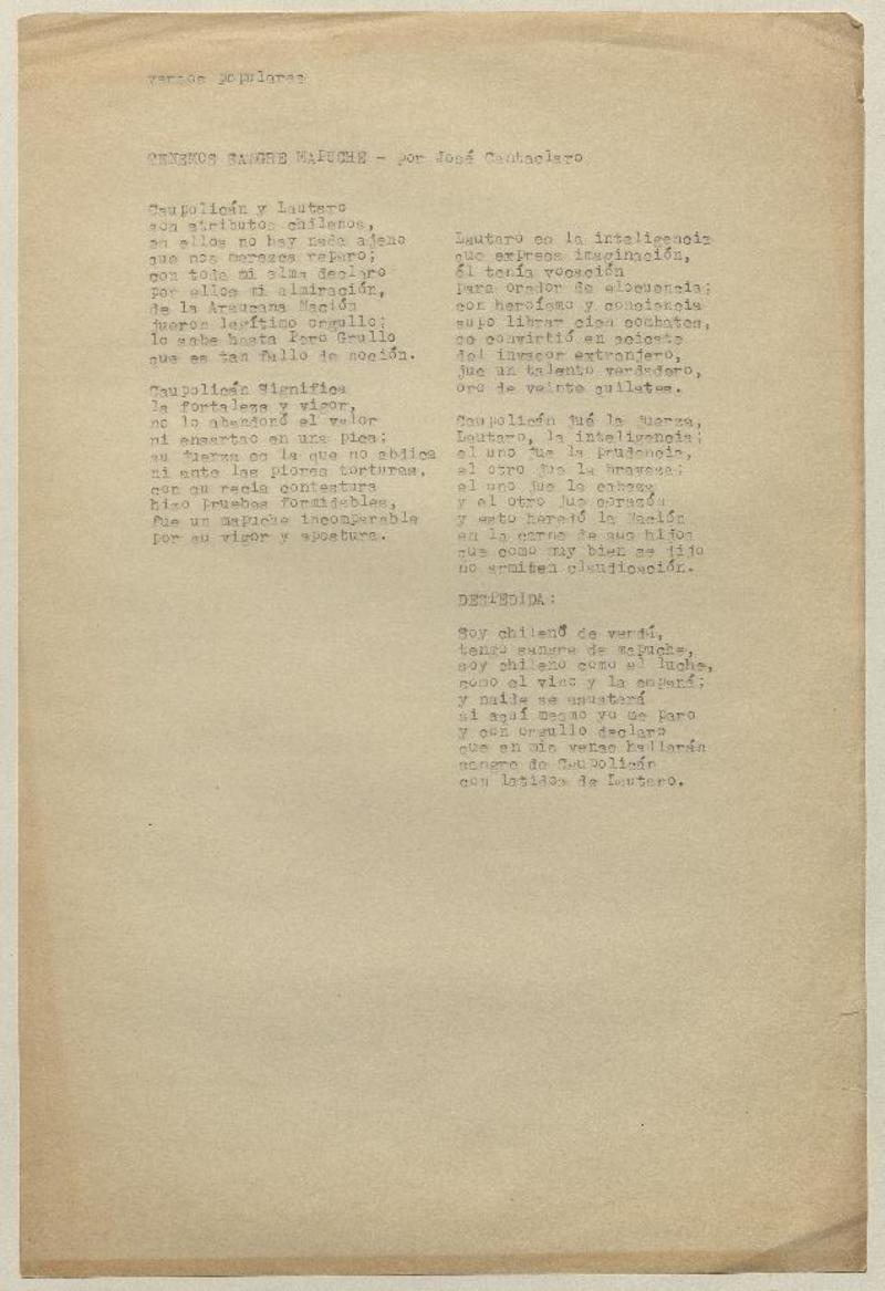 Tenemos sangre mapuche [manuscrito] por José Cantaclaro.