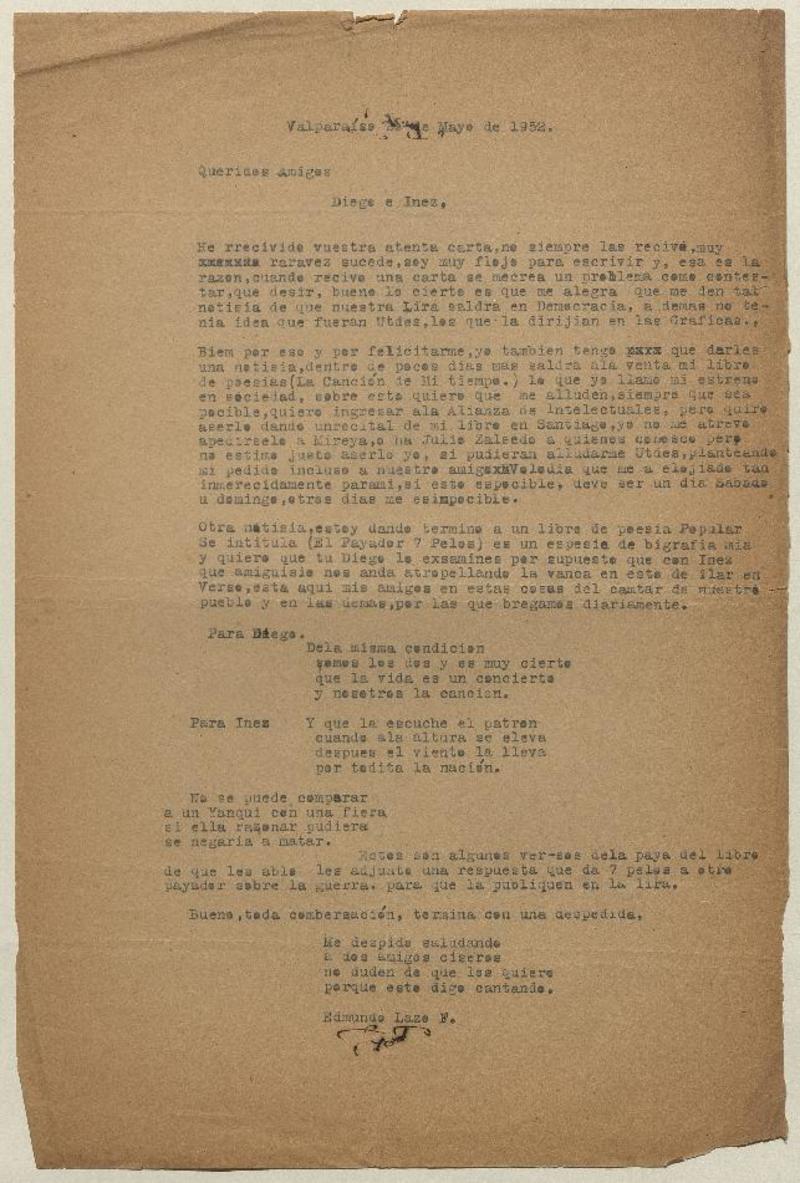 Valparaíso, Chile [a] Diego Muñoz e Inés Valenzuela Carta, 1952 mayo 20 [manuscrito] Edmundo Lazo F.