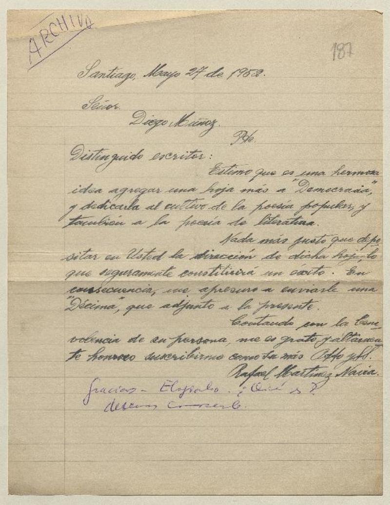 Santiago, Chile [a] Diego Muñoz Carta, 1952 mayo 27 [manuscrito] Rafael Martínez Navia.