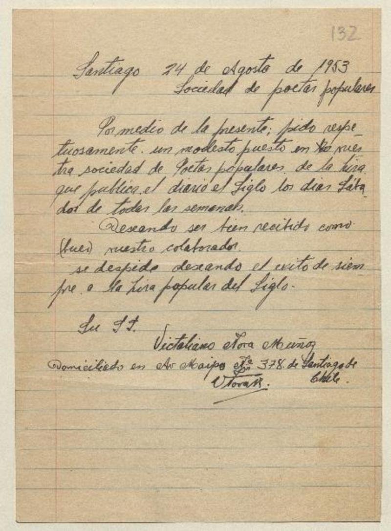 Santiago, Chile [a] Sociedad de Poetas Populares Carta, 1953 agosto 24 [manuscrito] Victaliano Nova Muñoz.